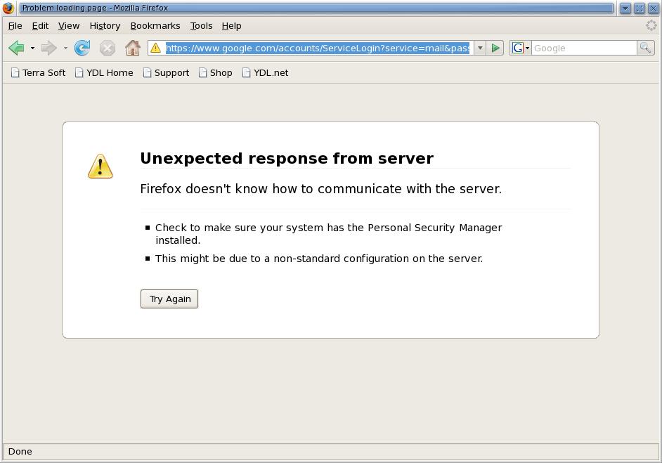 The next most annoying issue I encountered was the one I mentioned before. When I started Firefox after logging in the first time, I could go anywhere I wanted to on-line except any https:// Web sites. For some reason, Firefox complained about not having the Personal Security Manager, which was weird, because Firefox was installed (with all of the required pieces).