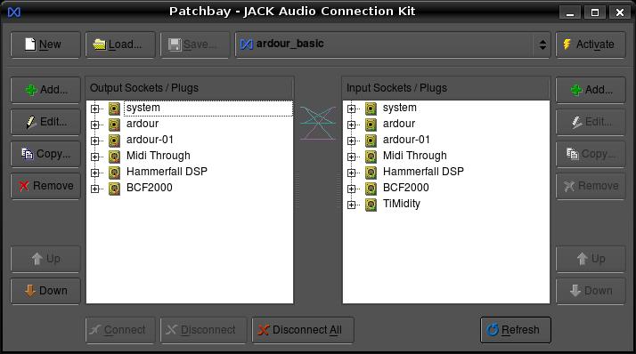 Once you've cross-connected the surface and Ardour, you can save the setup for future sessions, so you don't have to go through this rigmarole every time. Click on the patchbay button in qjacktcl. In the patchbay window that appears, click New, and then press Yes when you're presented with a dialog that asks whether you would like to “Create patchbay definition as a snapshot of all actual client connections”. Save the definition. Now, any time you start JACK, you can load up that patchbay setup by selecting it and clicking Activate.