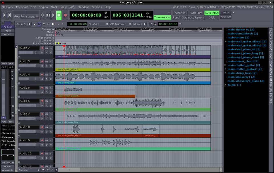 Figure 4. An Eight-Channel Song Mixdown in Ardour