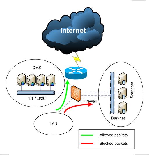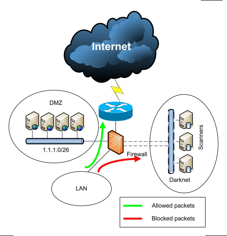 As shown in Figure 2, the network has been divided into two parts with a /26 mask. The Darknet part consists of silent “traffic catchers” or Network Intrusion Detection Systems (NIDS).