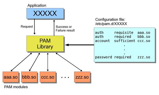 Figure 1. Whenever an application does an authentication request, the PAM library executes whatever modules are specified in the configuration file and decides whether to approve (success) or reject (failure) the request.