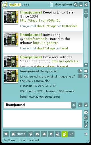 Many users prefer another AIR-based Twitter app, known as TweetDeck. As both are free, and both work well under Linux, so I suppose it's only fair to mention both. Twhirl is just my personal preference.