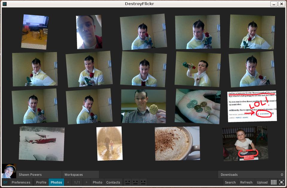 DestroyFlickr is a program that lets you manage your Flickr stream with an interface that resembles a light table. It's a convenient way to use Flickr.