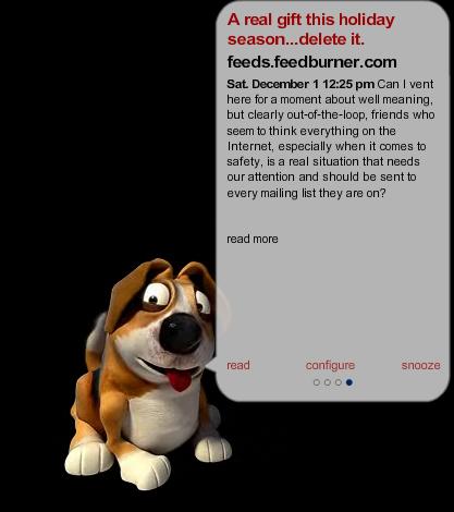 If you would prefer to have a cute fuzzy puppy read your RSS feeds to you while he rolls around on your desktop, you might prefer Pet-It RSS News by zerofractal.