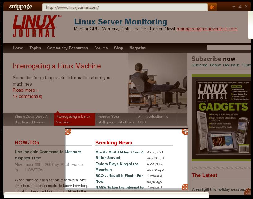 Snippage allows you to select a specific section of a Web site and make it display in a widget on your desktop. The Web site can update automatically, so if the page changes, so does the widget.