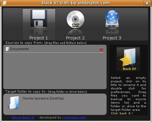Back It! is a simple utility for backing up a predetermined set of files and folders from one place to another. The program isn't complex, but it's a great example of AIR interacting with the underlying operating system.