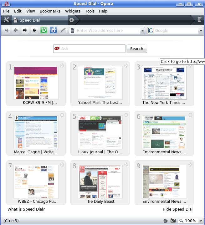 Here are some core features that distinguish Opera from its rivals. The Opera browser has the most interesting startup options of any Linux-based browser. First, upon opening a tab, Opera's default is Speed Dial, a sort of home page with nine customizable thumbnails for your favorite Web sites (Figure 1). Second, Opera lets you decide how to start each session—just as you left off, your home page, a blank page, via dialog or from a saved session. The built-in session manager is a powerful feature, given how many different tabs/windows the typical user has open concurrently. One can have saved sessions for different modes, such as home, work, finances, news, hobbies and so on.