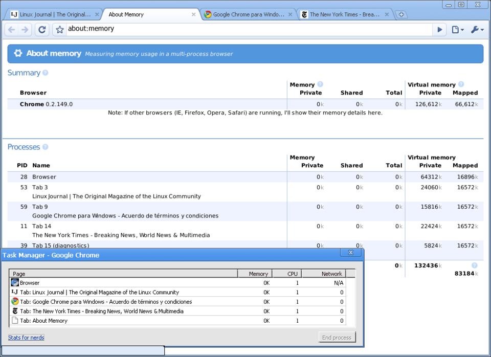 One unique feature our ilk will love on Chromium is the (for real) “Stats for nerds” function. When you call forth the task manager, you'll get a list of open Web pages, complete with memory status, CPU usage and network speed related to each page. On the task manager, in addition to an option to kill the process for each open page, you also can click on a Stats for nerds link, which pulls up a new tab complete with additional information such as PID, memory utilization for both the entire browser and each tab.