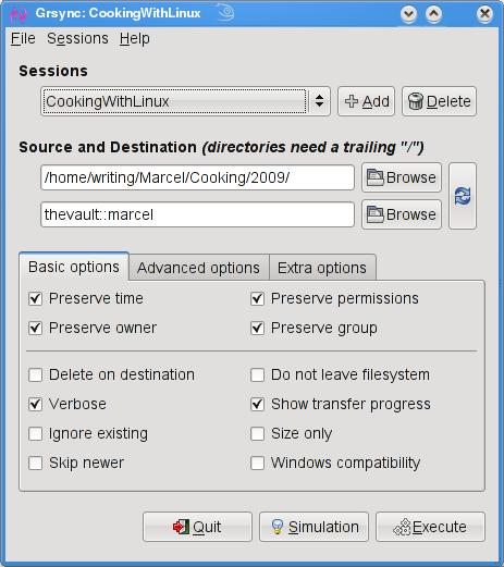 While providing a great front end to rsync, grsync also works as a teaching tool for the command-line version of the program, or at least it helps as a memory aid. Almost any command-line option available to rsync is covered in one of these three tabs: Basic options, Advanced options and Extra options. What makes it a learning tool is that if you pause over any of those check boxes with your mouse, a tooltip appears showing the command-line option with a brief description of its function.