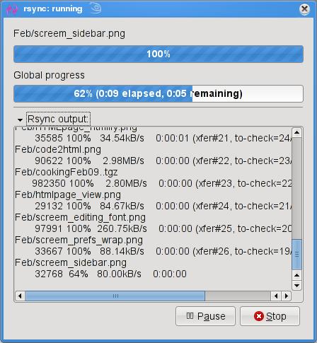 To start, click the Add button next to the session drop-down dialog and enter a name for your backup. You can define many different rsync backups here, and then launch them again at a later time. Clicking the Browse button brings up the standard Gtk2 file browser window from which you can select your local and destination folders. Unfortunately, you can't browse remote systems, but if you've already set up an rsync server, have no fear. You can enter it manually in the format I showed you earlier (for example, thevault::marcel/). When you are happy with the various options, click Execute. If you only think you are happy, click the Simulation button. (Chef Marcel loves a program with a sense of humor.) When you do click Execute, the program switches to a progress window (Figure 2), so you can see where you are in the process.