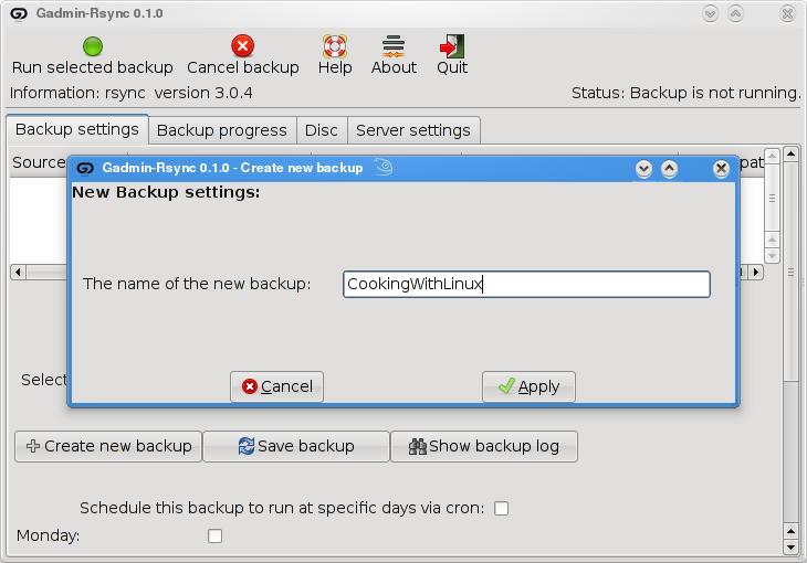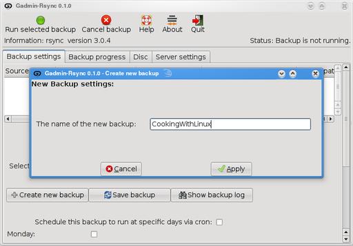 When you start the program for the first time, you'll be asked for a name to give your new backup (Figure 3). You could back up the entire system or select specific folders of filesystems. Choose a name that makes sense to you based on what you want to back up. Enter a name, then click Apply to continue.