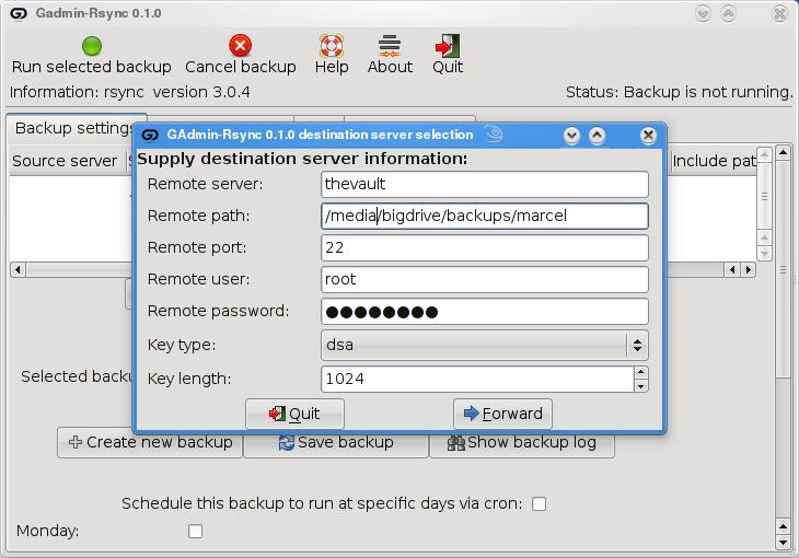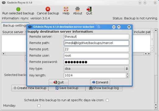 The next item on our rsync menu is Magnus Loef's GAdmin-Rsync. GAdmin-Rsync makes every aspect of creating an rsync backup a matter of filling in the blanks. What's more, the program creates backups using SSH by default, which means you can set up rsync backups to any machine to which you have secure shell access. This also means you don't actually need to have an rsync dæmon running on the remote machine if you have SSH access. Let me show you how it works.