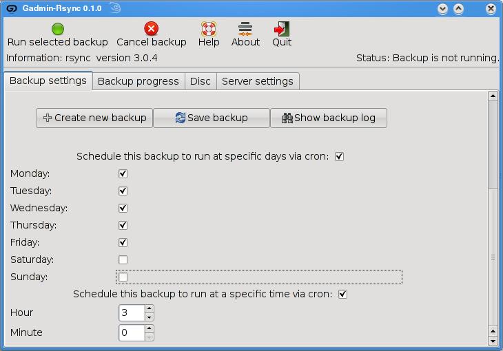 What is nice about this program is that you can (as with grsync) store a number of backup definitions, so you can choose to back up your documents, music or digital photographs when it suits you. GAdmin-Rsync goes further though. If you take a look down at the bottom of the window on the Backup settings tab, you'll notice the words “Schedule this backup to run at specific days via cron” and a check box (Figure 6). Check the box, then scroll down to choose the days you want the backup to run. A little further down, you can specify the time as well.