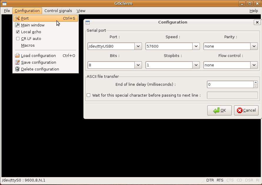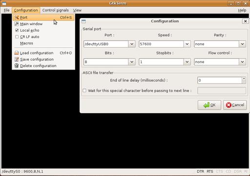 In order to pass commands back and forth though the serial cable, the easiest tool to use is a serial port terminal. There are several versions of this type of software available. Here, I use gtkterm, a GUI terminal, but if you prefer CLI tools, both screen and minicom will work. After installing and launching gtkterm, you have to set the correct port under Configuration→Port. The port will be the device specified earlier, and if you are unsure which number to choose, you may have to try them all. The speed should be set to 57600 (baud). The other default settings (No parity, 8-bit, 1 stopbit and no flow control) are fine. I also prefer to turn on Local echo, which also is under Configuration and lets you see what you type.