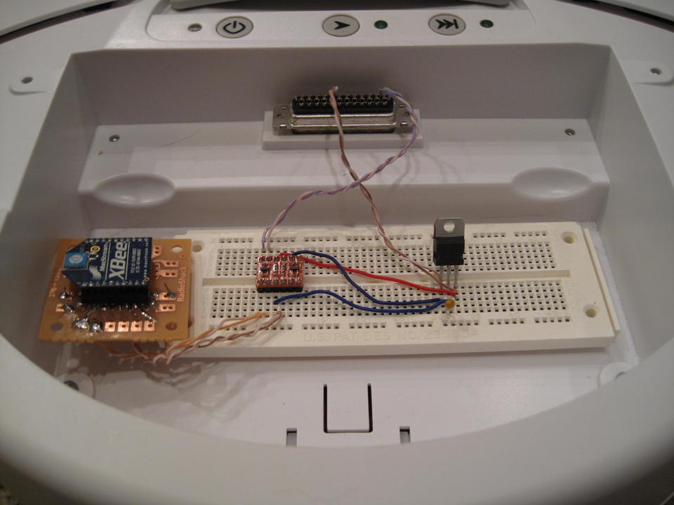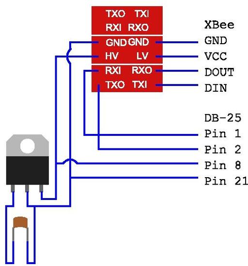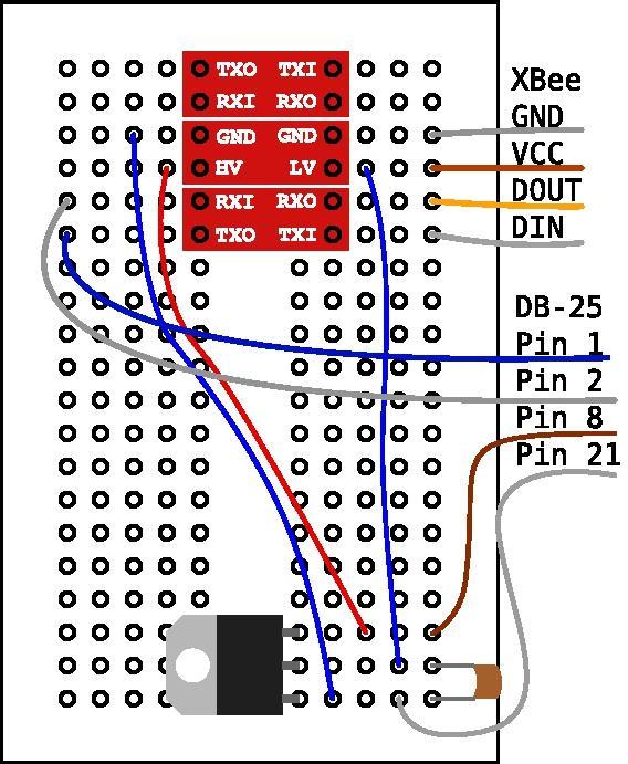 After the sockets are soldered, remove the module and solder four wires to VCC, DOUT, DIN and GND. After that, solder four more wires to the male DB-25 connector on pins 1, 2, 8 and 21. The pins should be labeled, although the markings are faint. Next, break off two six-pin lengths from the strip of male header pins, and solder them to each side of the level converter. Again, it is easiest if you use the breadboard as a jig to hold the pins straight as you solder them. Finally, assemble everything according to the schematic (Figure 2) and/or the breadboard wiring diagram (Figure 3). The completed breadboard is shown in Figures 4 and 5.