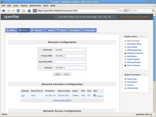 The system screen is where you can set up and adjust the overall system parameters, like the IP address of the machine or its high-availability/replication partner. It even embeds a Java-based SSH client in the console, so you can get a shell on the machine if you need to, although any SSH client works as well. Note: it's important to define the hosts or networks that your OpenFiler will serve here. If you don't do that, your OpenFiler will refuse to serve files via NFS or SMB/CIFS. It's not difficult to add—I simply dropped a statement to cover my 192.168.1.0/24 in there—but OpenFiler stubbornly refused to talk to any machines until that was added. Another thing to note here is that OpenFiler supports the creation of bonded Ethernet interfaces, so if you're building a mission-critical file server, you can put two network cards in the server, connect each card to a different network switch, and then you have fault tolerance at the network level.