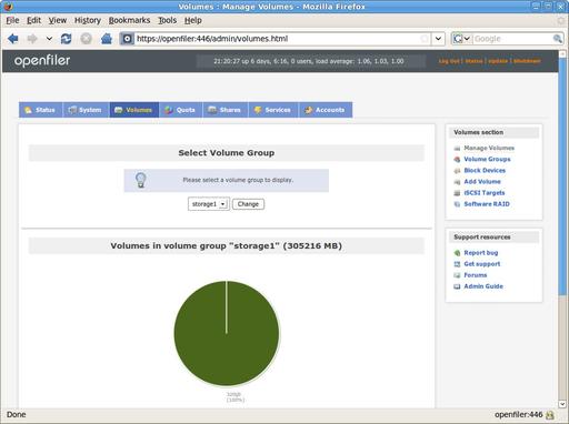 The volume manager is where you can add disks to your OpenFiler, create filesystems and manage software RAIDs. OpenFiler uses the Linux Logical Volume Manager (LVM) as its volume manager, and it supports both ext3 and XFS filesystems for storage that's locally attached to the OpenFiler host. In this case, because I'm using an embedded PC, I had to attach a 320GB disk via USB to OpenFiler. It wasn't a problem—OpenFiler happily allowed me to create a volume group using that USB disk, and then I could create a volume within that group and start laying out the filesystem.