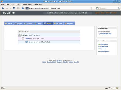 Because OpenFiler uses Linux LVM, you easily can aggregate storage devices into a single pool and then slice that up as desired into whatever network share you want. Another benefit of using the Linux LVM is that point-in-time snapshots can be taken quickly and easily, allowing for consistent backups to be taken of the OpenFiler appliance.