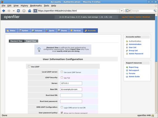 The last tab in the admin console is the accounts manager, which is where you define what authentication methods you'd like OpenFiler to use. You can run an internal LDAP server on the OpenFiler itself, and create the users and groups locally. You also can point the OpenFiler to your corporate LDAP if you have one. If you're in a Windows environment, you can set up OpenFiler to use your corporate Active Directory for authentication or even an old-school NT4-style domain.