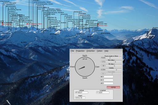 gipfel helps to find the names of mountains or points of interest on a picture. It uses a database containing names and GPS data. With the given viewpoint (the point from which the picture was taken) and two known mountains on the picture, gipfel can compute all parameters needed to compute the positions of other mountains on the picture. gipfel can also generate (stitch) panorama images.