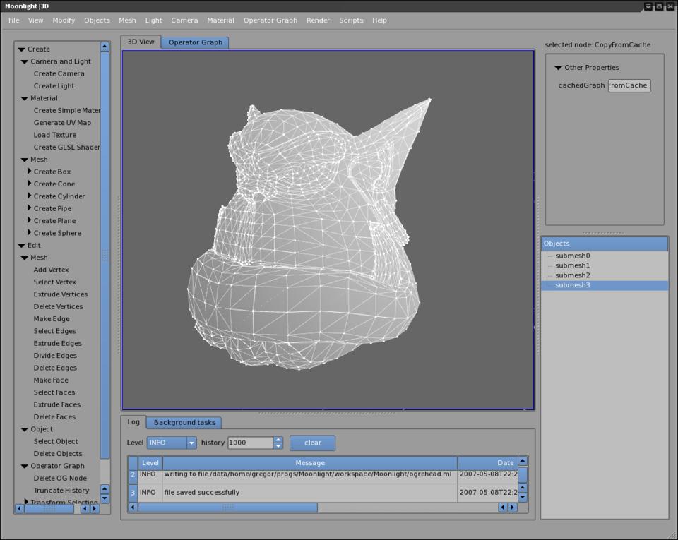 Moonlight|3D is a modeling and animation tool for three-dimensional art. It currently supports mesh-based modeling. It's a redesign of Moonlight Atelier, formed after Moonlight Atelier/Creator died in 1999/2000. Rendering is done through pluggable back ends. It currently supports Sunflow, with support for RenderMan and others in planning.