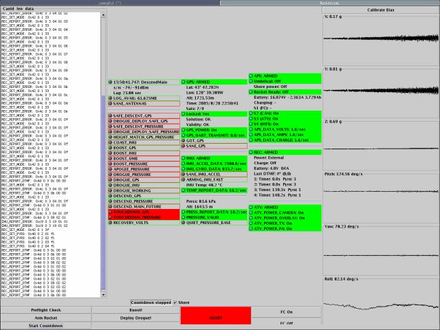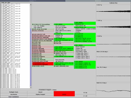 “...3...2...1. We have liftoff!” The ground crew could see the streaming video from the rocket showing the ground become farther and farther away. The Java RocketView software displayed the rocket's sensor data: GPS coordinates, acceleration, rotation, pressure and the state of all the rocket's subsystems. Everything looked good.