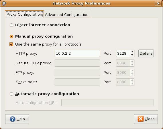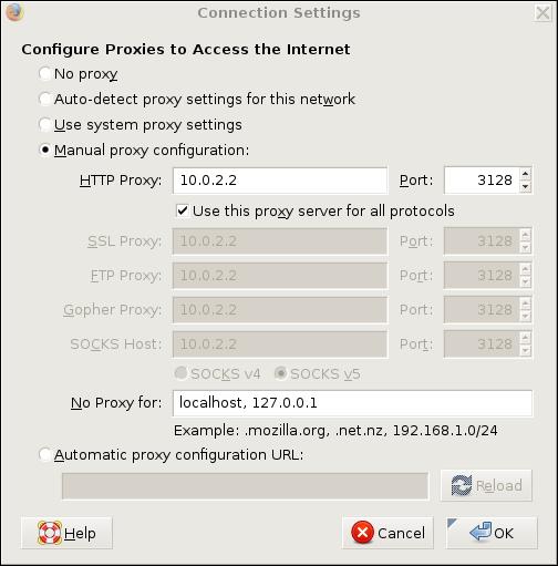 In Figure 1, we've selected Manual proxy configuration and entered in an HTTP Proxy address (which can be either a hostname or IP address) of 10.0.2.2 and Port number 3128, which is Squid's default listening port for client connections. We've also selected the box to Use this proxy server for all protocols, resulting in the same values being copied automatically to the subsequent settings for other types of proxies.