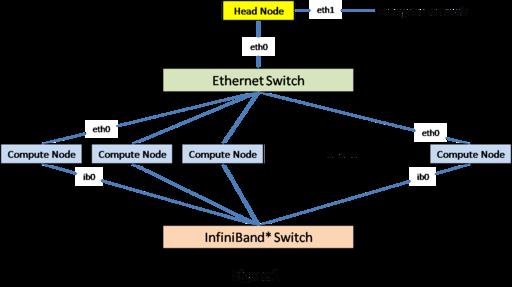Now that you have all the compute nodes configured and in the rack, it's time to set up the communications network. Figure 1 shows a typical networking setup for a simple compute cluster. In this configuration, the Ethernet fabric most likely would be used for administrative purposes, while the InfiniBand fabric would carry the compute traffic. If you don't have InfiniBand hardware available, you can just ignore the bottom section of the diagram. The Ethernet fabric can carry both the administrative and compute traffic.
