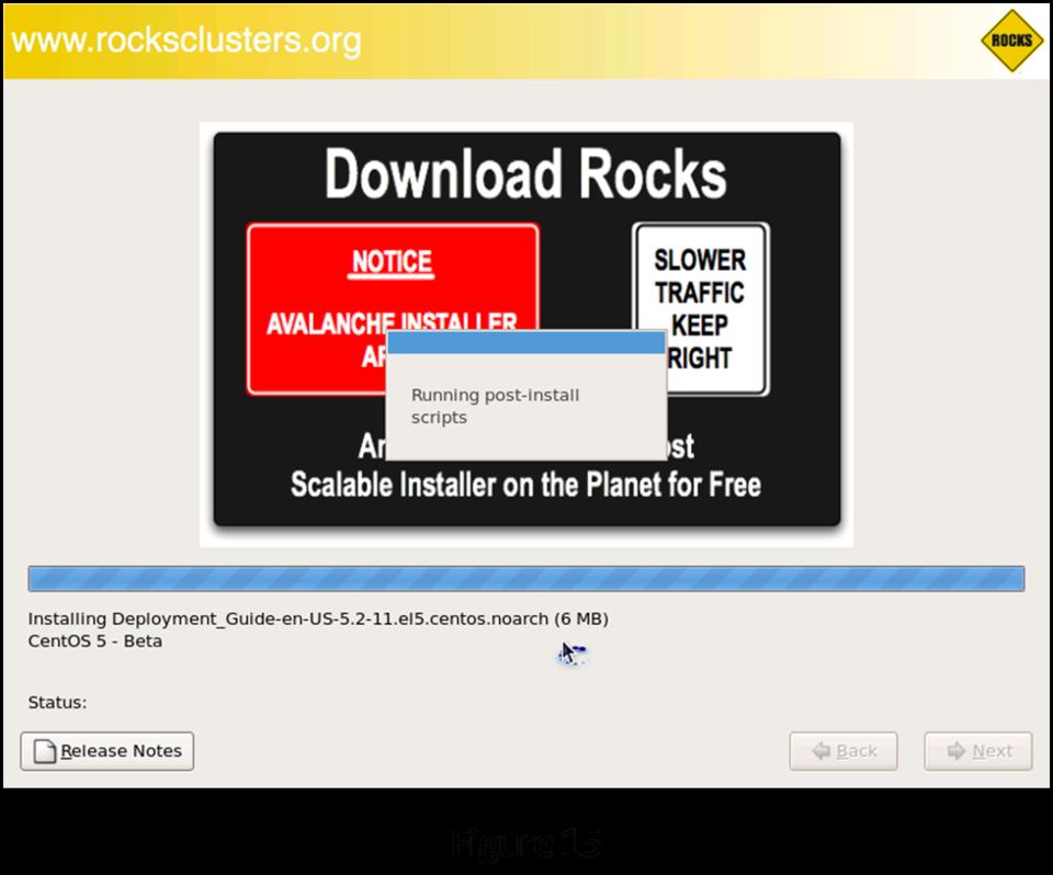 If you have multiple disks on the head node or you want to arrange the disk in a different fashion, select Manual Partitioning. This takes you to the standard Red Hat manual partitioning screen where you can configure things any way you desire (you still need to have a 16GB / partition and an /export partition at minimum though). Clicking Next on the disk-partitioning screen begins the automatic portion of the installation (Figures 13, 14 and 15). Once installation is complete, the head node reboots, and you are greeted with your first login screen (Figure 16).