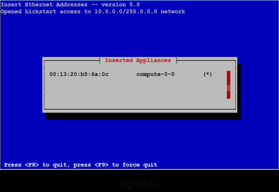 The insert-ethers routine displays the MAC address it has received and the node name it has assigned that node. The ( ) will be filled in with an asterisk (*) when the compute node begins downloading its image (Figure 21).