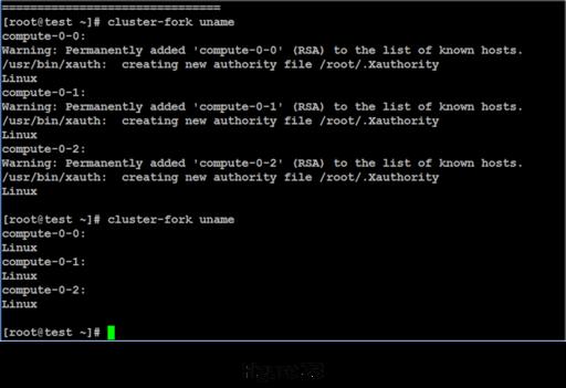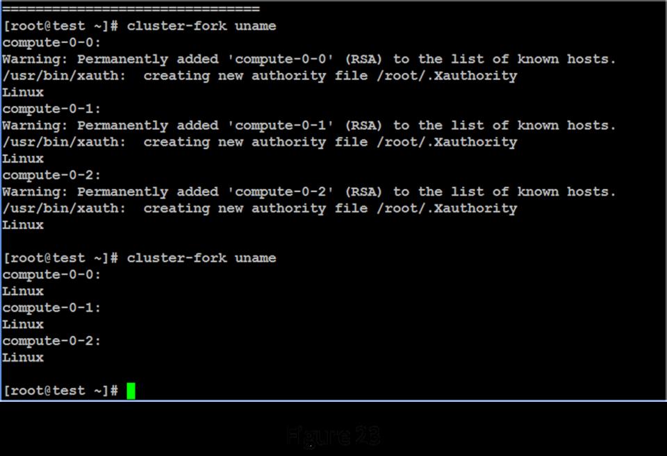 Your cluster now is complete and ready for work. First job: roll call. The Rocks cluster-fork function allows the user to execute the same application on all or a subset of the nodes in the cluster. Figure 23 shows executing the uname command via cluster-fork.