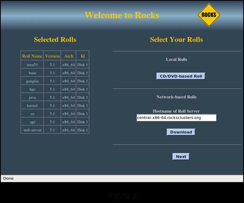The installation now repeats the first screen, showing your selections (Figure 5). If you are satisfied with your selections, click Next to continue to the first of the administrative screens in the installation. If you want to make a change, click CD/DVD-Based Roll to go back to the component selection screen.