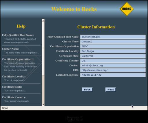Enter build at the boot: prompt to start the installation sequence. The system boots in the normal Linux fashion and eventually presents the user with the initial Rocks configuration screen shown in Figure 3.