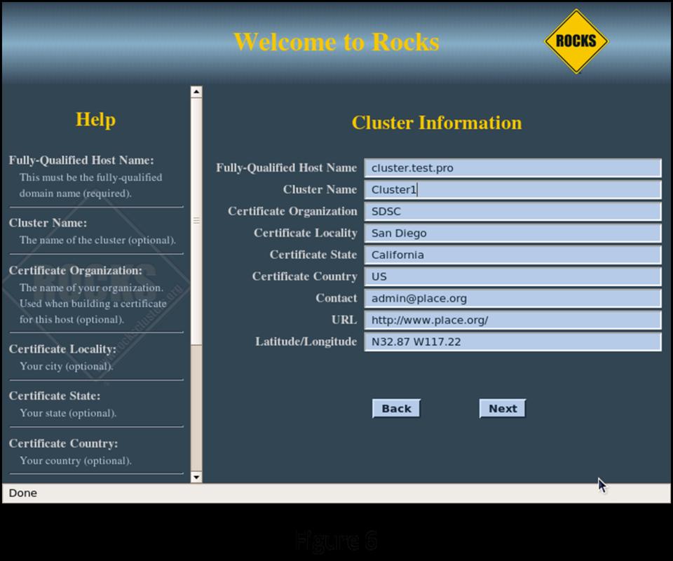 The next screen (Figure 6) allows you to enter information about your cluster. If the cluster will be connected to your enterprise network, you should enter a fully qualified hostname to be consistent with your domain. The cluster name you enter in the Cluster Name field will appear in the management screens during cluster operation. Once you are satisfied with your entries, click Next to go to the configuration of the head node network connection to the private network (eth0).