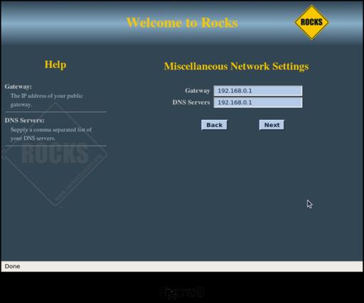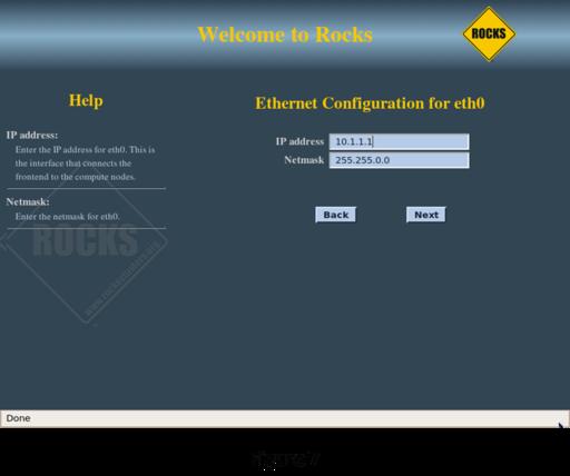 As you enter data on these screens, the installation routine is building a small MySQL database that details all of the component configurations in your cluster. The various tables Linux needs to run (like /etc/hosts) will be generated as an SQL report from this database. If you want to make changes in the system's configuration, the tools that Rocks provides actually change the database first, then run the appropriate reports to regenerate the system configuration files. This significantly reduces the chance for errors to creep into these files. It still is possible to edit the automatically generated system files manually, but remember that the next time you use the Rocks tools to reconfigure the cluster, your manual changes will be overwritten by the automatically generated SQL report versions.