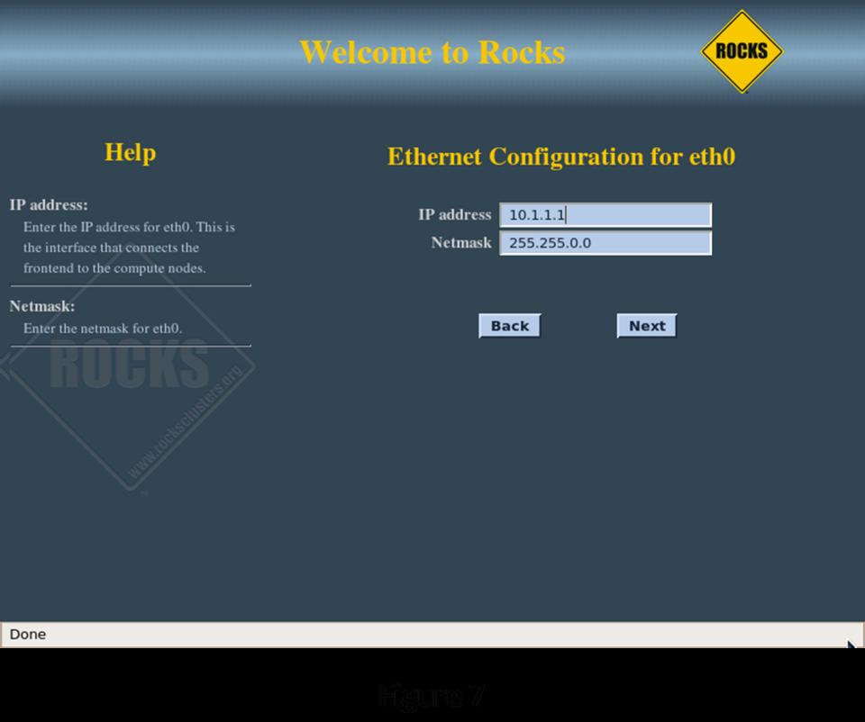 The next screen (Figure 7) lets you configure the cluster's network. The installation routine automatically selects 10.1.1.1 as the IP address for eth0 on the head node. Because this is a private network, you probably won't need to change this setting. If your public network also happens to be in the 10.1.X.X configuration, change this to something that doesn't conflict with your existing network. Clicking Next brings up the head node public network connection configuration screen.