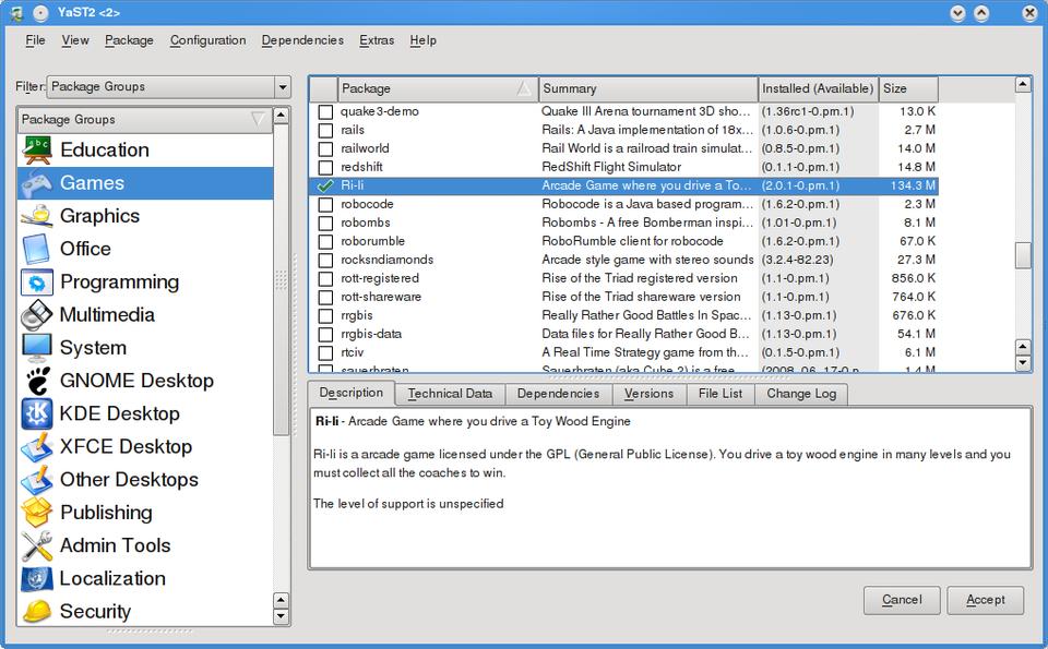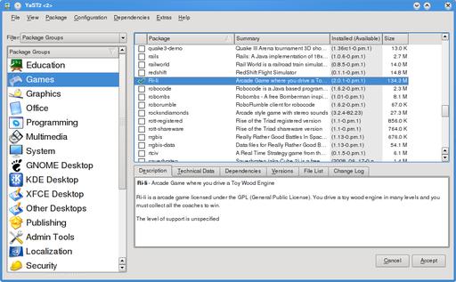 Click on a package name, and a description of the software appears in the tabbed Description window in the right lower half of the screen (Figure 1). If this is the package you want, click on the check box next to the package name, then click the accept button in the bottom right-hand corner. Should there be dependencies associated with the package you chose to install, a pop-up window appears informing you of that fact. Click Continue, and the installation proceeds. That's all there is to it. If you'd rather browse, click the drop-down box labeled Filter, and select Package Groups to discover packages arranged according to, yes, groups. Looking through games, say you discover a cool-sounding program called Ri-Li, a wooden train arcade game, and decide to install it (Figure 1). By the way, Ri-Li actually is a great game, and I highly recommend it. Your kids will love it.