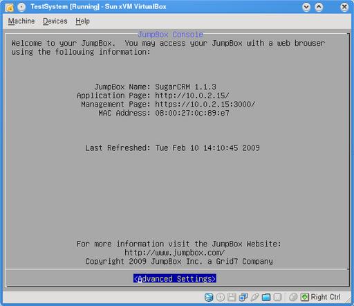 One last thing, and this is where it's actually easier with VMware's Player (which isn't GPL'd software, unfortunately). You'll see only one hard disk attached on the left. JumpBox appliances generally use two virtual disks for each machine: one for the root (root.vmdk) and one for data (data.vmdk). You need to add the data disk as well. Click the blue Hard Disks link, then navigate to the data disk and add it. The only thing you really need to be careful about here is making sure the root disk is first in line, as VirtualBox will boot from the hard disk. You'll find yourself back at the VirtualBox start screen but with at least one virtual machine ready to start. Click the Start icon, and your virtual appliance boots. Once booted, the virtual machine displays some information about the machine. On first boot into a virtual appliance, that screen most likely will have three links (Figure 10).