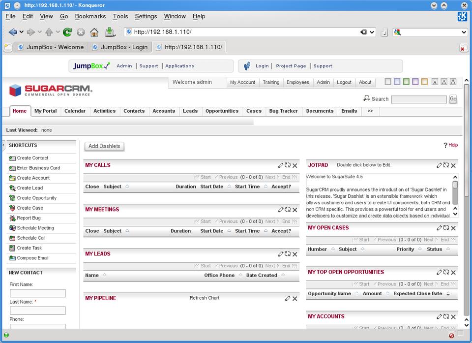 Of course, the real excitement comes from trying out that cool application or suite. By downloading a JumpBox virtual appliance and simply booting it (in either VMware Player or VirtualBox), I pretty much have instant access to a full SugarCRM implementation without all those steps involving Web servers, databases and so on (Figure 12).