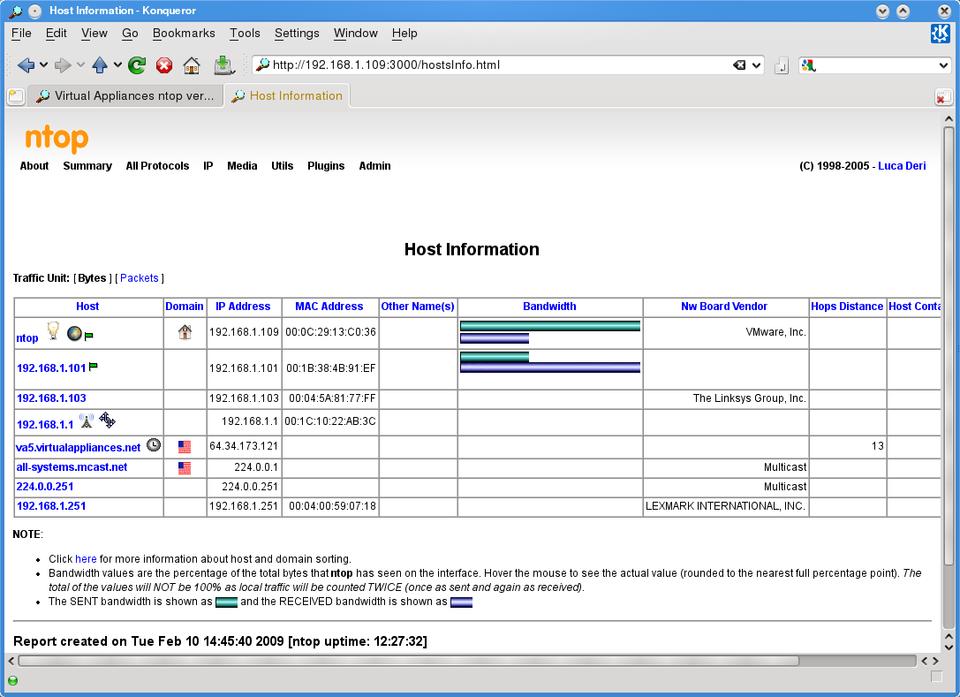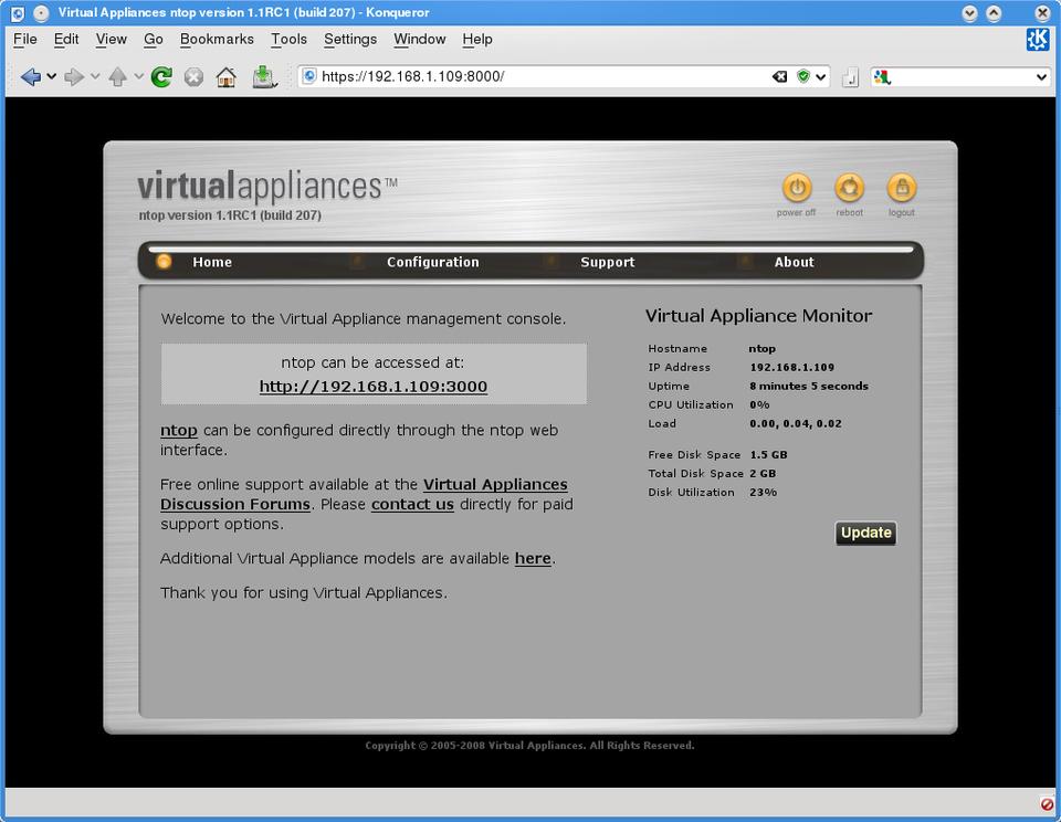 Figure 5. The virtual appliance, in this case using ntop, is up and rolling seconds after the boot completes.