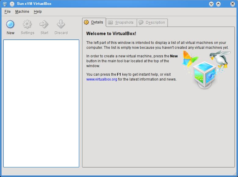 Visit virtualbox.org, download a copy of VirtualBox for your distribution, and install it. When you start VirtualBox the first time, there are no machines running in it. Think of it as a blank slate, or better yet, a new computer with a blank hard drive waiting for your favorite distribution (Figure 6).