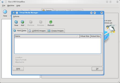 Next, you need to tell VirtualBox about the virtual appliance image. To do this, click File on the menu bar and select Virtual Media Manager. When the window appears (Figure 7), you can start adding the virtual disk images from which you'll boot your machine. Click the Add button, then navigate to the SugarCRM virtual appliance folder. Look for the root folder and attach the root.vmdk file. Usually, that vmdk file is all you need, but with JumpBox, there's another step that I'll visit shortly. Click OK to continue.