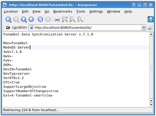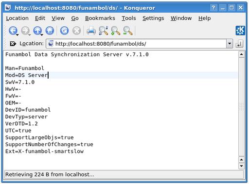 The whole thing takes only a few seconds. The steps that follow are extremely simple. Type yes at the “agree to the above terms” prompt (it's the GPL version 3). You'll be prompted for an installation directory which, by default, is /opt. It's best to accept the default unless you have a very good reason to do otherwise. The resulting folder will be /opt/Funambol. Once the product has been extracted, you'll be asked whether you want to start the server. Type yes and continue on. To make sure things are working properly, point your browser to http://localhost:8080/funambol/ds, and you should get status information back from the Funambol data synchronization server (Figure 1).