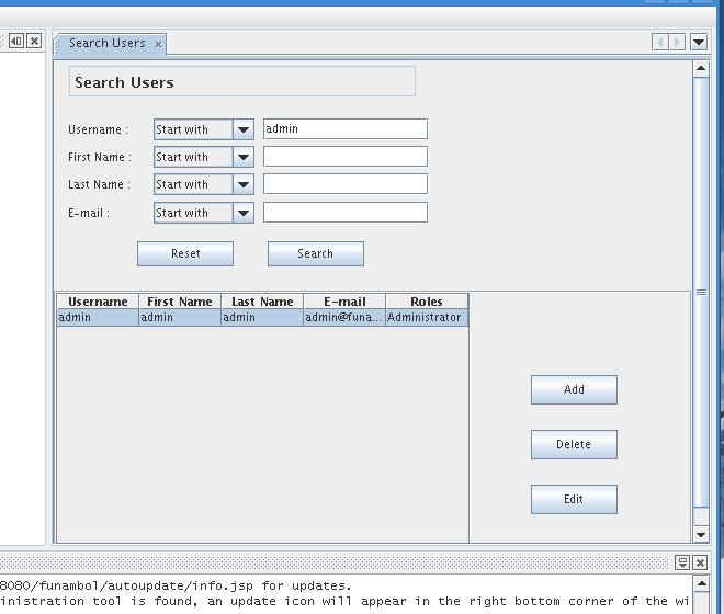 Double-click on Users and look at the admin tool window (Figure 5). The Search Users tool appears. You can search by user name, first name, last name and e-mail address. Enter admin in the search box beside Username, and click the Search button (notice that you can search by a part of the name as well as position of the text by clicking the drop-down box beside the label). Only one admin name should show up, so it naturally will be highlighted. If you did this by searching for part of a name, and you had multiple names, you would, of course, need to select the correct name.