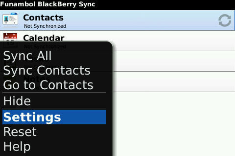 Click the icon, and you should see a status screen showing Contacts, Calendar, Tasks and Notes, all with Not Synchronized below the labels. To perform a sync, you need to configure the client. Press the menu key on your BlackBerry, and select Settings (Figure 8).