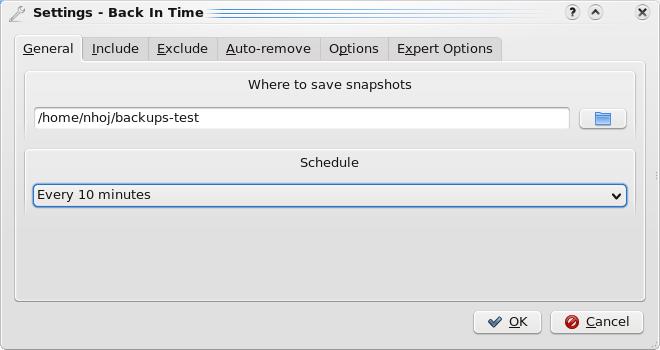 Once you're inside, Back In Time is a pretty basic affair. On a first-time run, it starts off with the Settings Dialog, where you define where the backup snapshots are saved, what folders to back up and how often to do it (among other features).