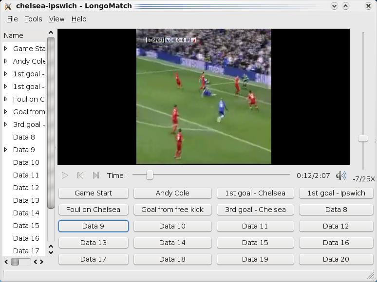 Click the Play button again, and the video plays until the next event you want to mark. Repeat the steps for Data 1 on the Data 2 button. From here, you will start to build a timeline of events, and obviously, you take the same steps for each data point. If you want to fast-forward or rewind, you can use the slider bar, which is very handy on tedious junior soccer matches! The vertical slider bar on the right controls the playback speed, allowing you to slow down to catch an important Chelsea goal or speed up when you're watching nine-year-olds play out their enthralling 90 minutes of football.
