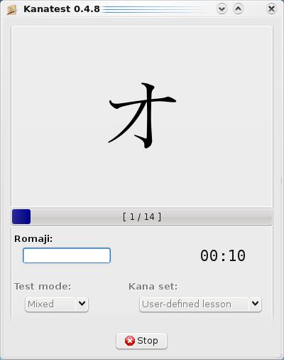 Kanatest is a Japanese kana (Hiragana and Katakana) simple flashcard tool. During testing, Kanatest displays a randomly selected kana char (respecting mode and lesson) and waits for the user to answer with the expected romaji equivalent. This process continues until all questions are answered or all questions are answered correctly (depends on options). At the end of the test, a short info page about drilling time and correctness ratio is displayed. The results are stored, and users can review their performance at any time.