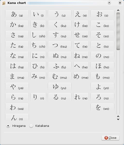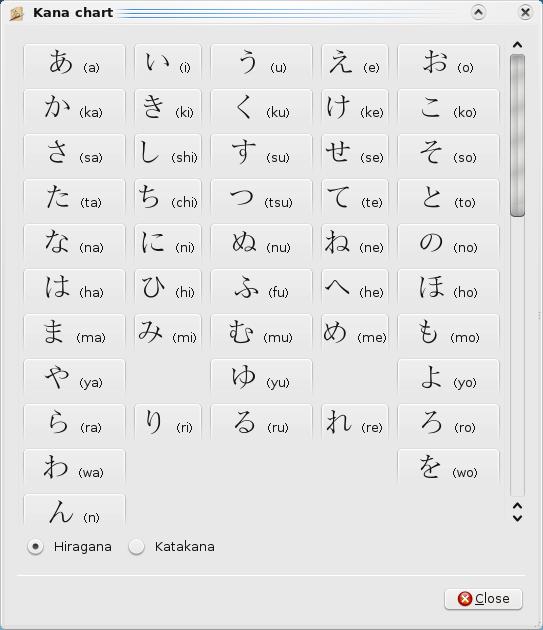 What's great for advanced students is that you also can be tested on kana combos such as kyo, ji, kyu and so on. For beginners who have only seen kana for the first time, don't panic, as there's a kana chart available on the program's main screen in that cluster of four buttons on the right. Included in the chart are all the characters in both Hiragana and Katakana, as well as their combinations, such as pya, myu and so on.