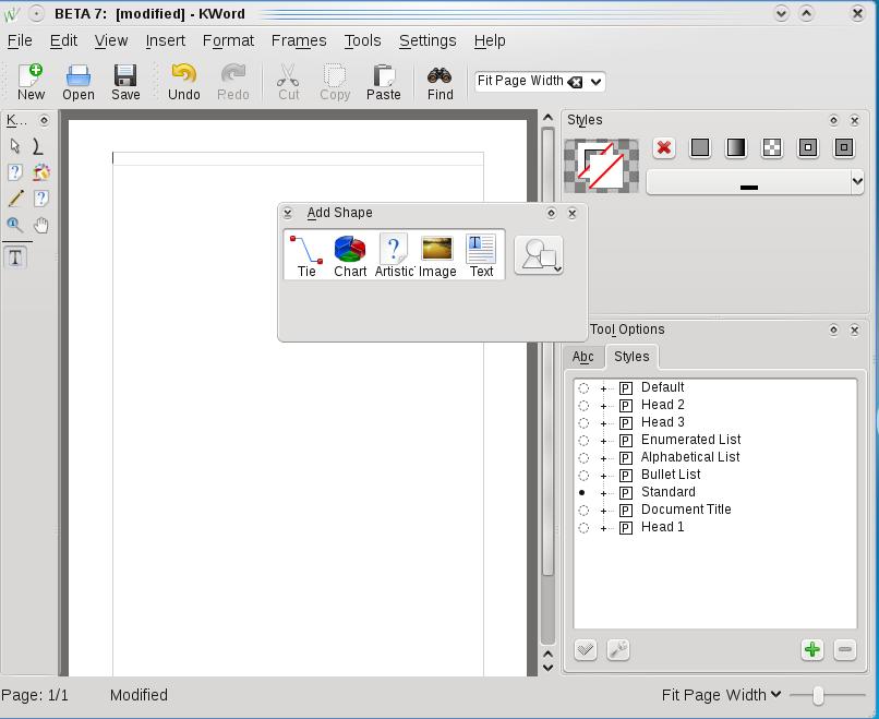 Now, in KOffice 2.0, the concept of frames has been replaced with the less abstract and better-labeled ones of shapes—no doubt as a result of implementing the new Flake library. As in earlier releases, you still have to select a type then drag with the mouse in the editing window to create it, but now, with the default set of dockers, you are more likely to notice and use the tool.